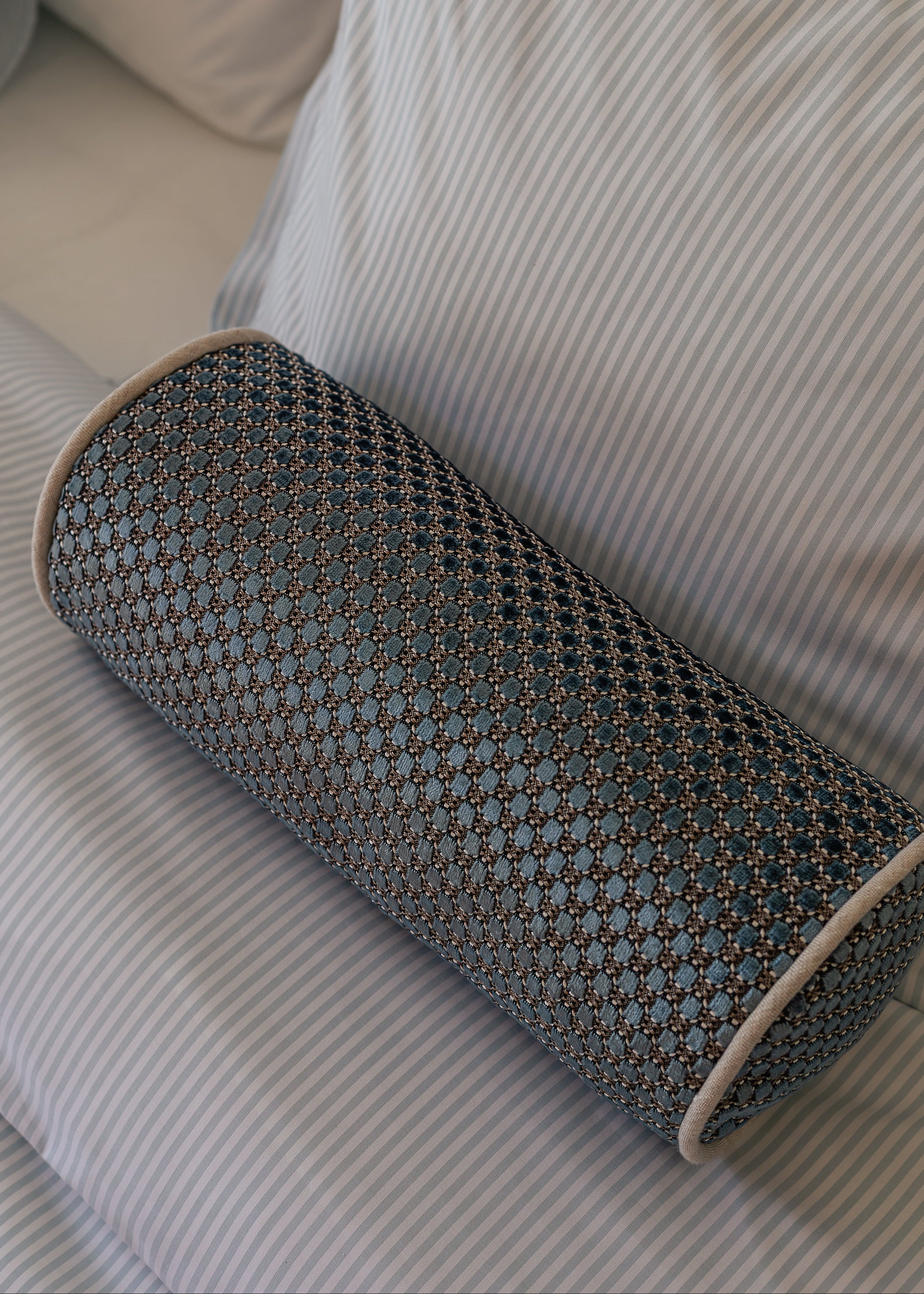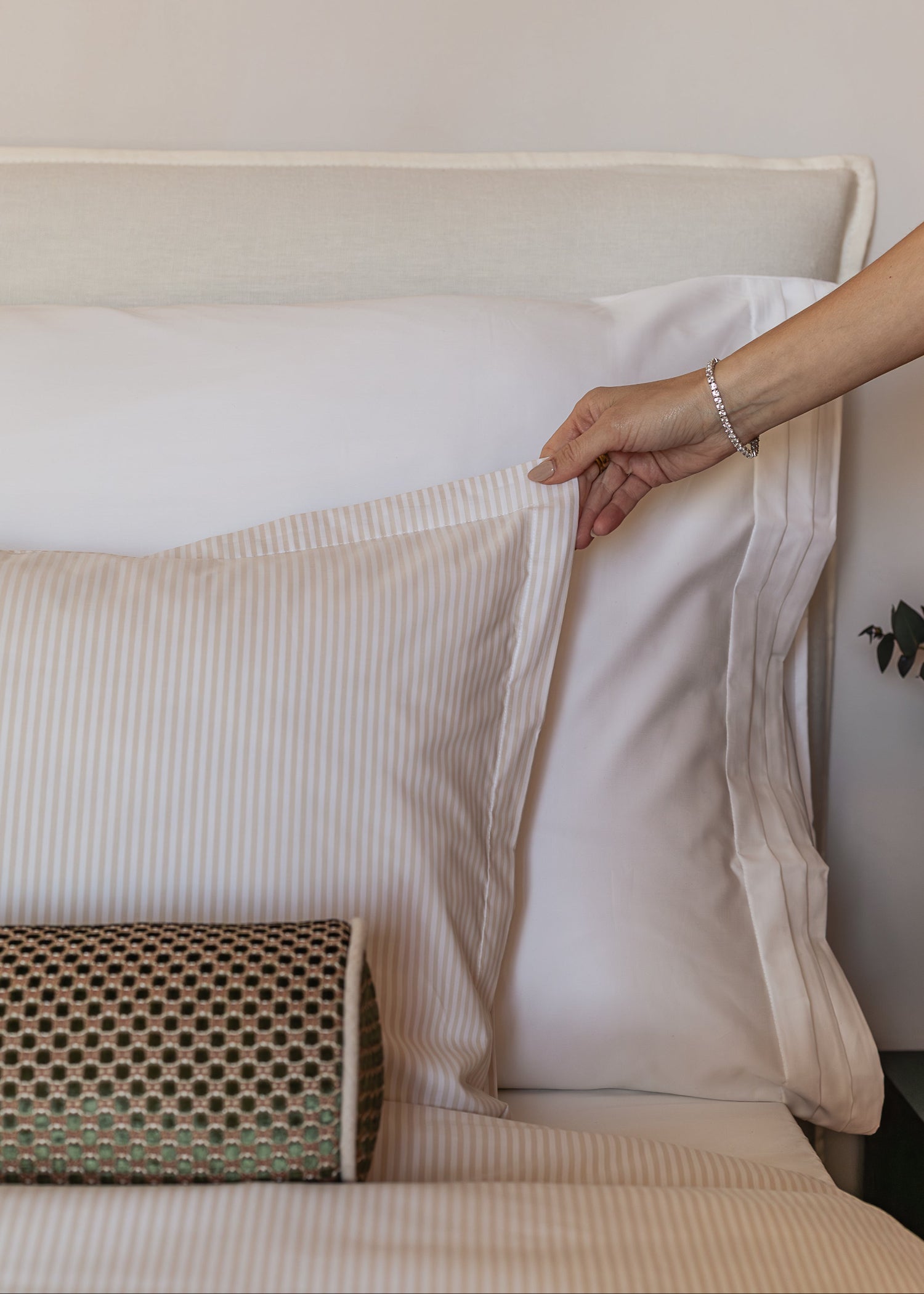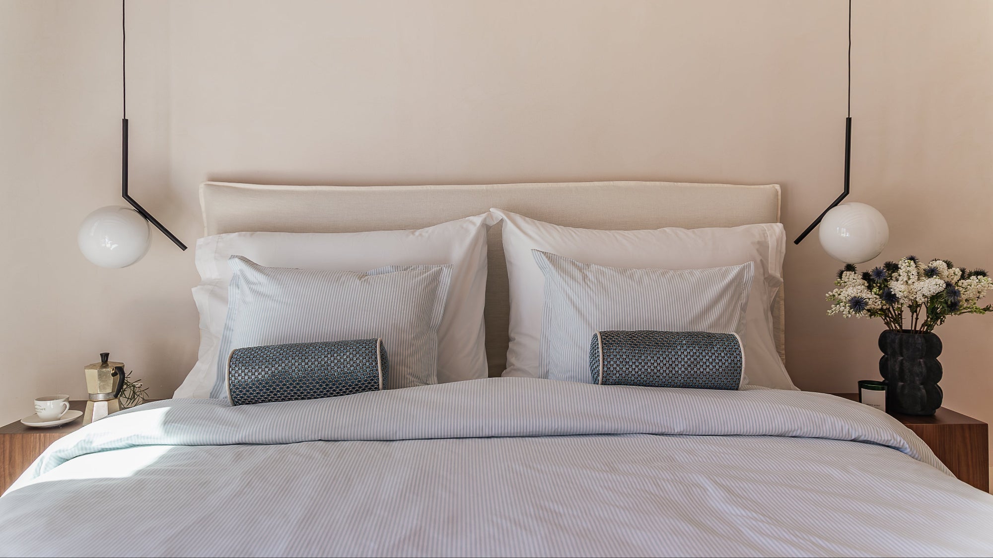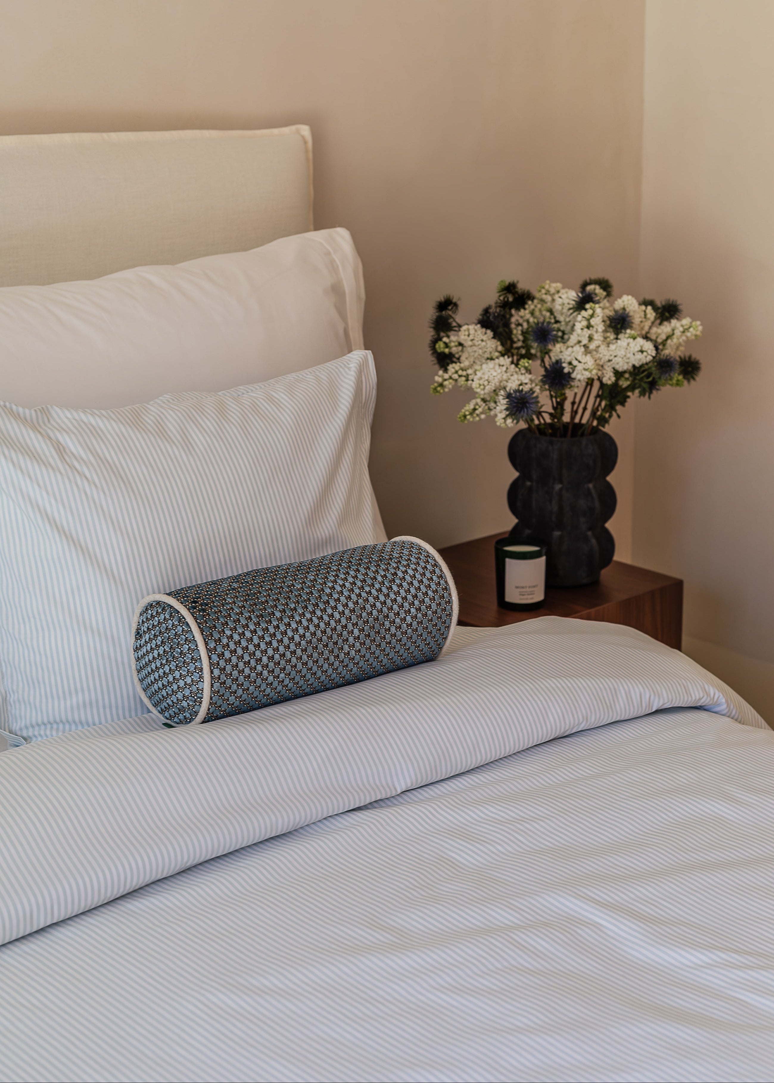 Kollektionen finns i Snow White och i randigt i nÄgra av vÄra mest klassiska fÀrger North Sea Blue, Beach Sand och Sky Blue. Tidlösa fÀrger som skapar ett lugnt och inbjudande sovrum.