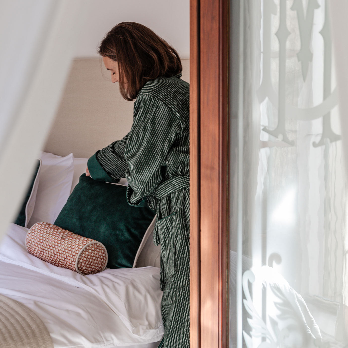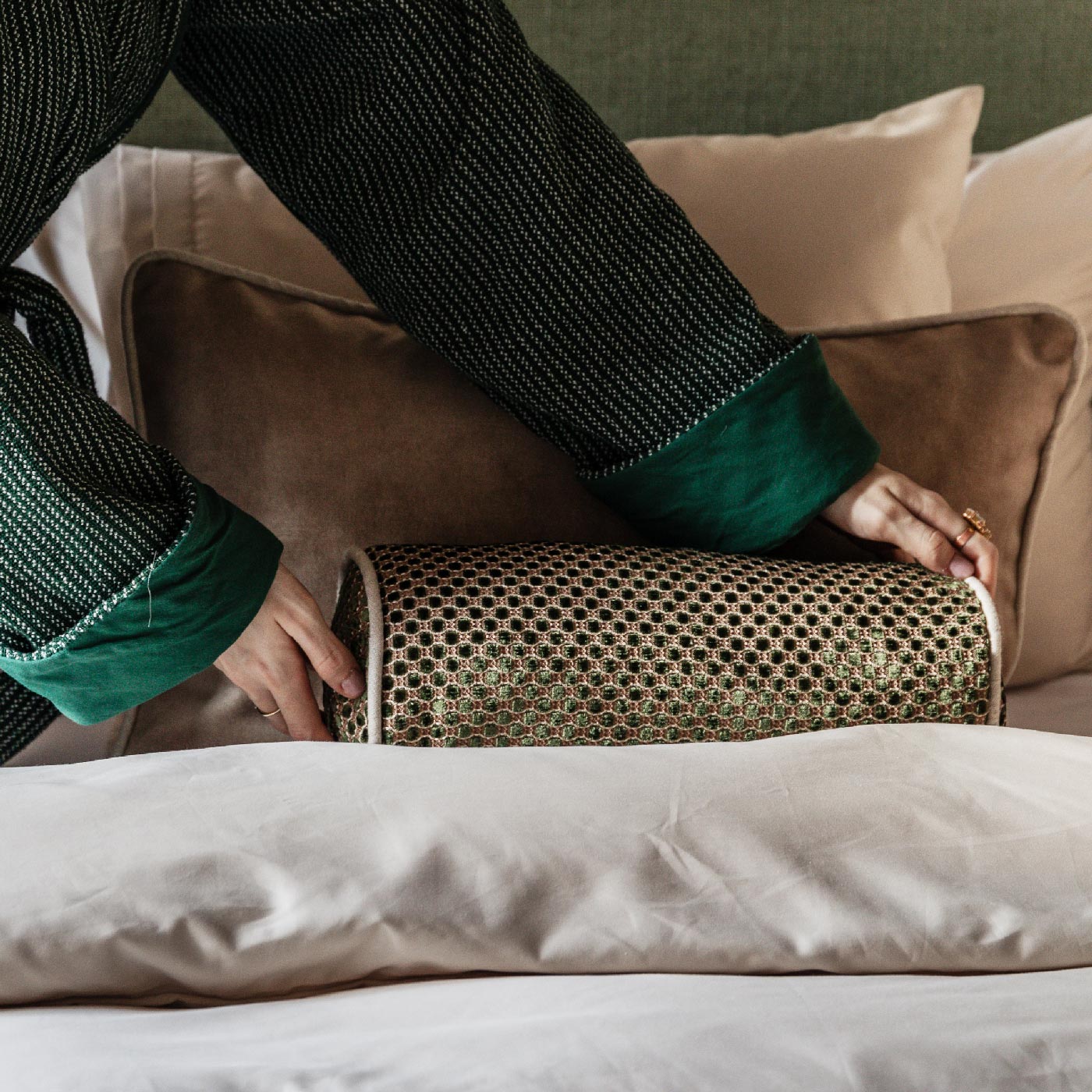 Varje kudde och överkast Àr handgjorda i Stockholm av fina franska och engelska tyger med miljövÀnliga inlÀgg frÄn Danmark - designade för att komplettera vÄra sÀngklÀder och skapa en sann boutiquehotellstÀmning hemma.