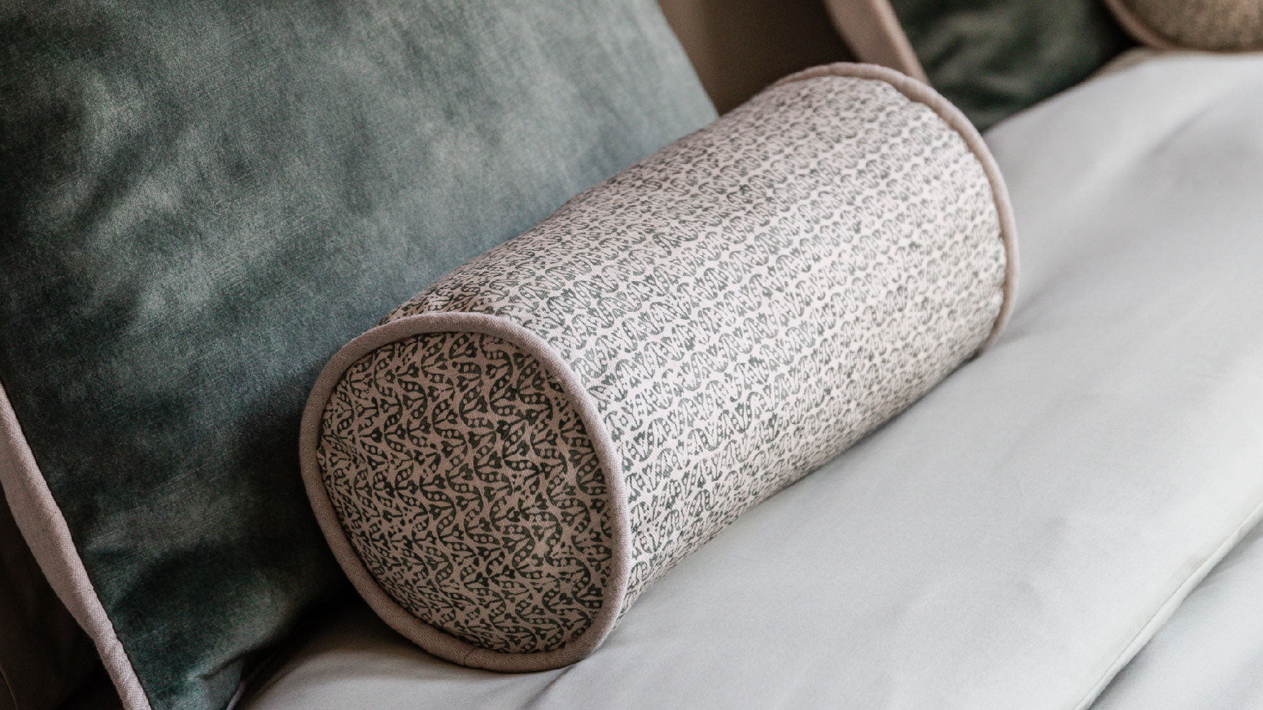 Med ett cylinderformat kuddfodral frÄn Junipers Palma-kollektion skapas direkt en oemotstÄndlig boutiquehotell-kÀnsla hemma. De Àr handsydda i Sverige i en kombination av exklusiva tyger och en elegant piping ur kollektionens signaturfÀrg. Helt perfekt för dig som vill skapa en harmonisk, stilren mix-and-match-bÀddning i premiumklass.