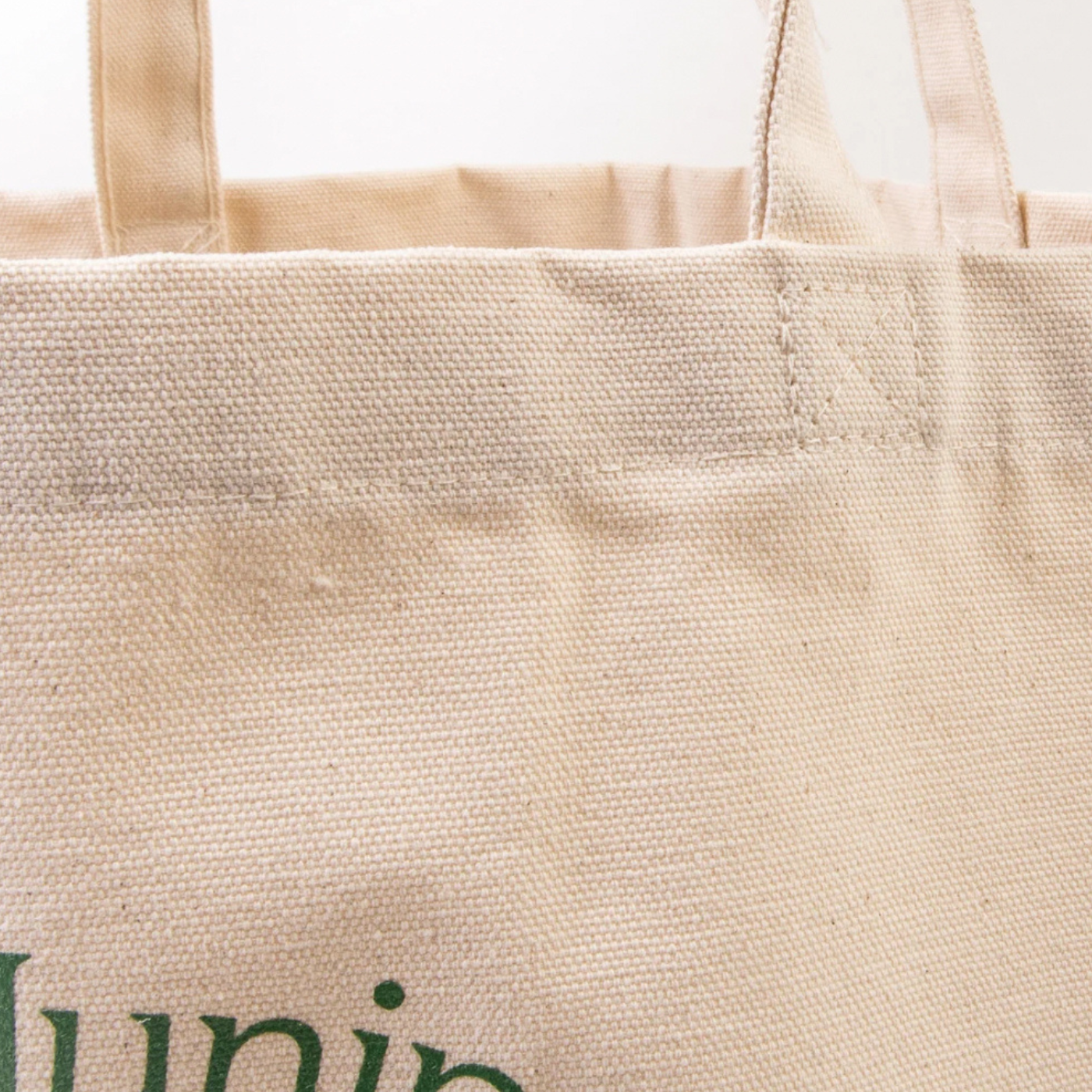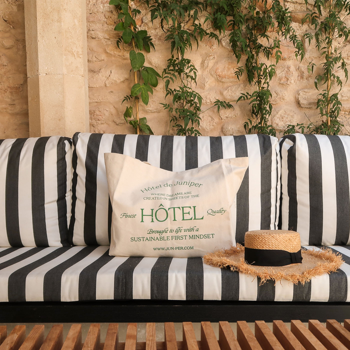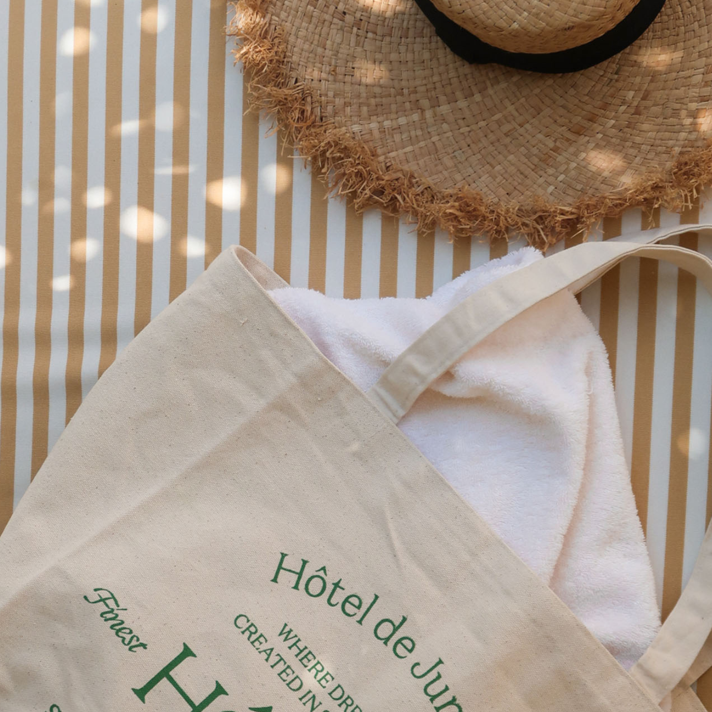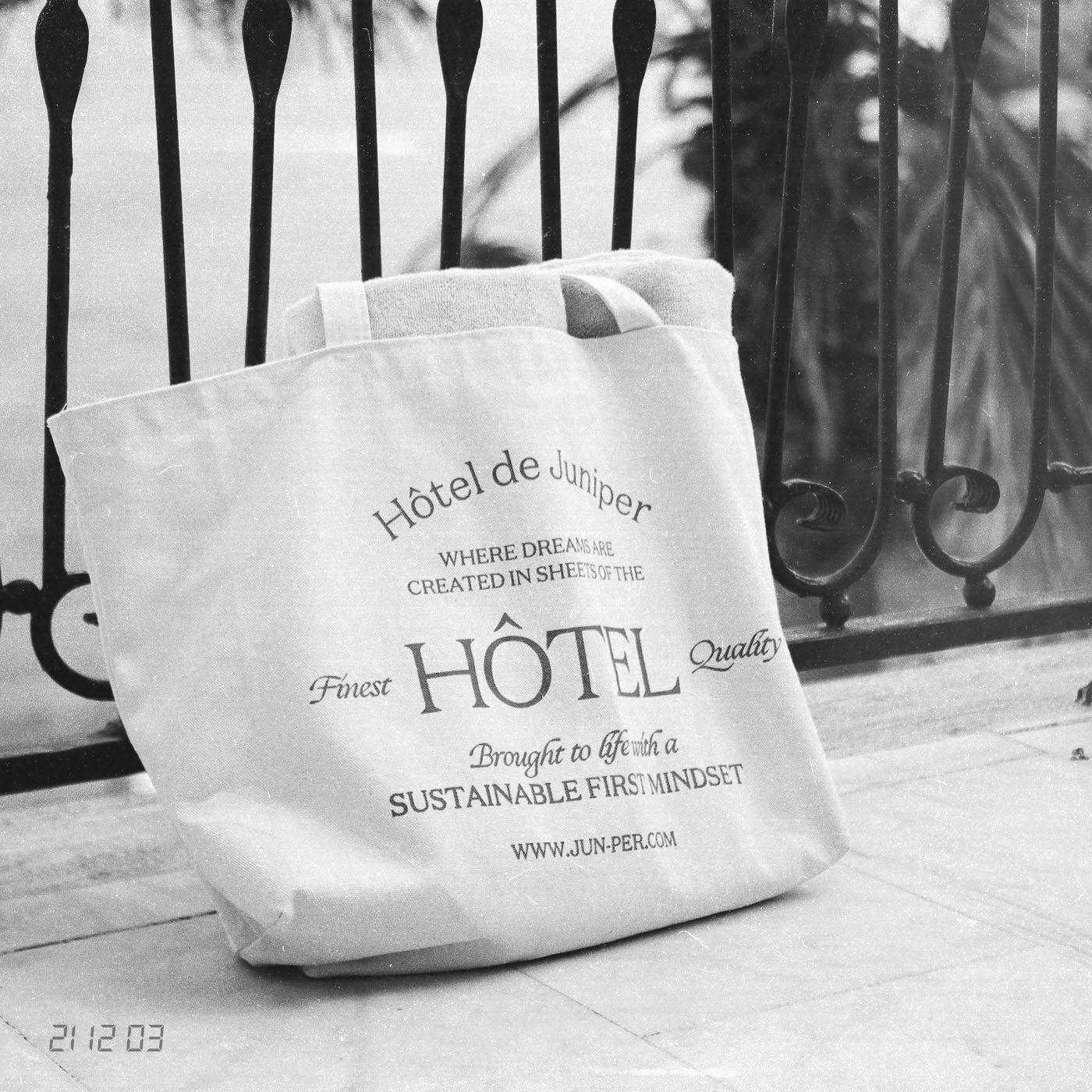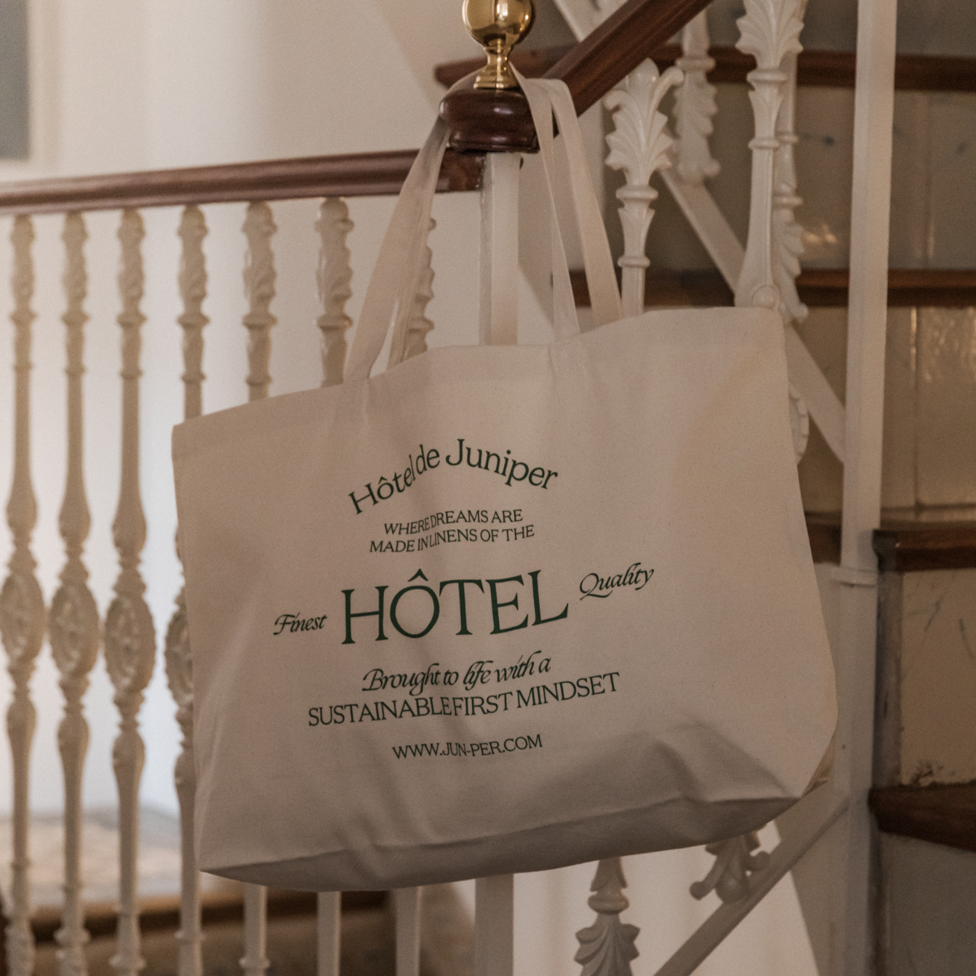 VÄr allra första HÎtel de Juniper tote Àr tillverkad i en robust bomullscanvas och kan anvÀndas med stil - Àven om du tar med dig halva ditt bibliotek av inbundna böcker till poolextravagansen. Den Àr tillverkad i en naturlig bomullsfÀrg och har HÎtel de Juniper -trycket pÄ ena sidan i vÄr mörkgröna signaturfÀrg.