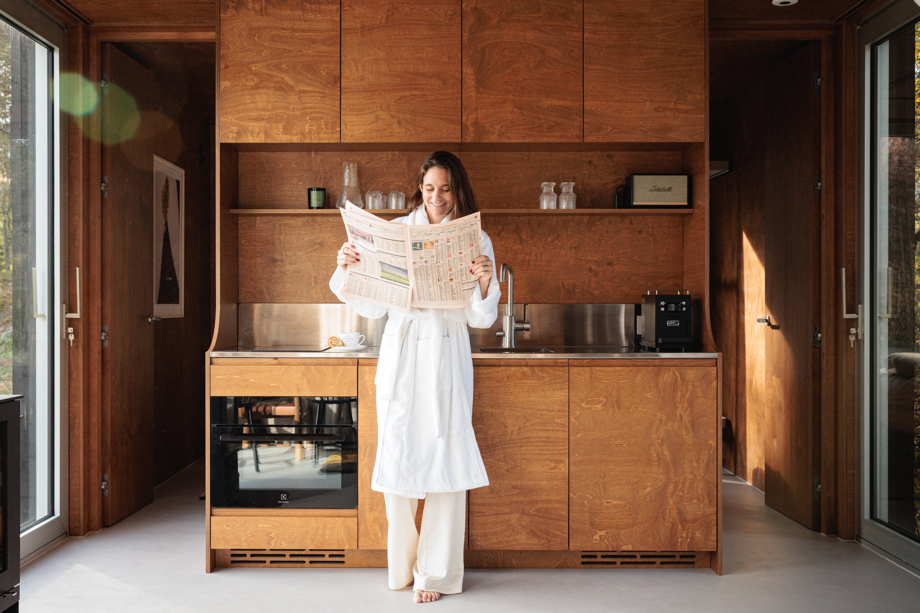 Varje stuga Àr kompakt men samtidigt luftig pÄ 42 eller 52 kvadratmeter och skapad för att "sudda ut" grÀnsen mellan inne och ute. De stora fönstrena frÄn golv till tak ramar in landskapet som konstverk och trÀets noggrant utvalda finish, signerad av Martin-Löf, ger interiören en mjuk och hÀrlig vÀrme. Det Àr vad Umberto kallar ödmjuk lyx - komfort, hantverk och omtanke i varje detalj.